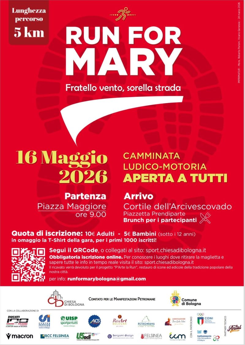 news Pastorale Sport Turismo e Tempo Libero, Run For Mary 2023 16 Marzo 2026 Run for Mary 2026 Run For Mary 2026 Run for Mary 2026 Fratello vento, sorella strada Bologna, 16 Maggio 2026 ore 9.00 condividi su